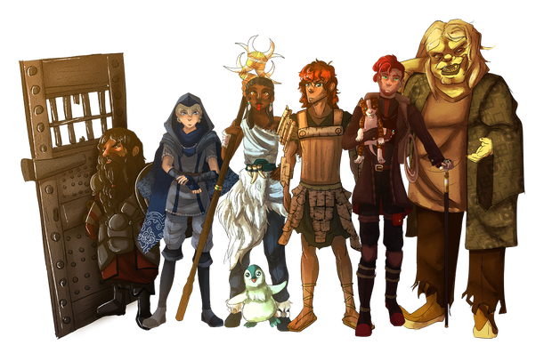 The party redesign that came with reaching level 5. With 5 being a big milestone I wanted everyone's poses to feel a little braggadocios and dynamic. However nothing too over the top so that way they can be built upon as the players grow. The water color effect really adds to the fantasy element