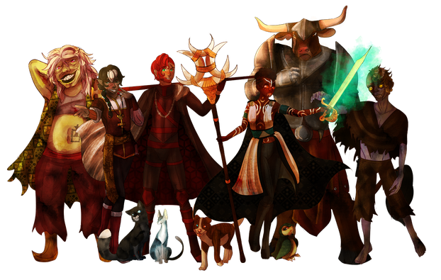 The original designs when we were still trying to feel out the setting and the characters. Some of the biggest changes being Ryai's height and the inclusion of Amethyst. I tried to keep with everyone's designated color which gave the party a more simplistic look. (and Konguq's Parka intimidated me lol)